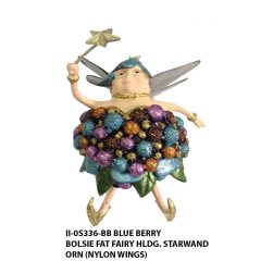The Bolsie Blueberry Fat Fairy with Delicate Wings is handcrafted from resin and fine-wired net wings. Hand Painted with Blueberry and pink glittered dress to bring an individual touch to anyone’s collection